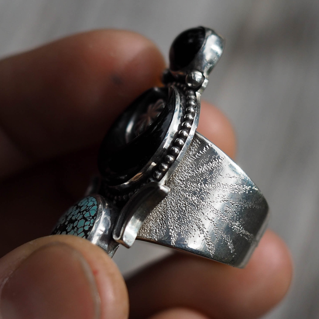 sterling silver, fine silver, Sand Hill turquoise, onyx, water buffalo horn