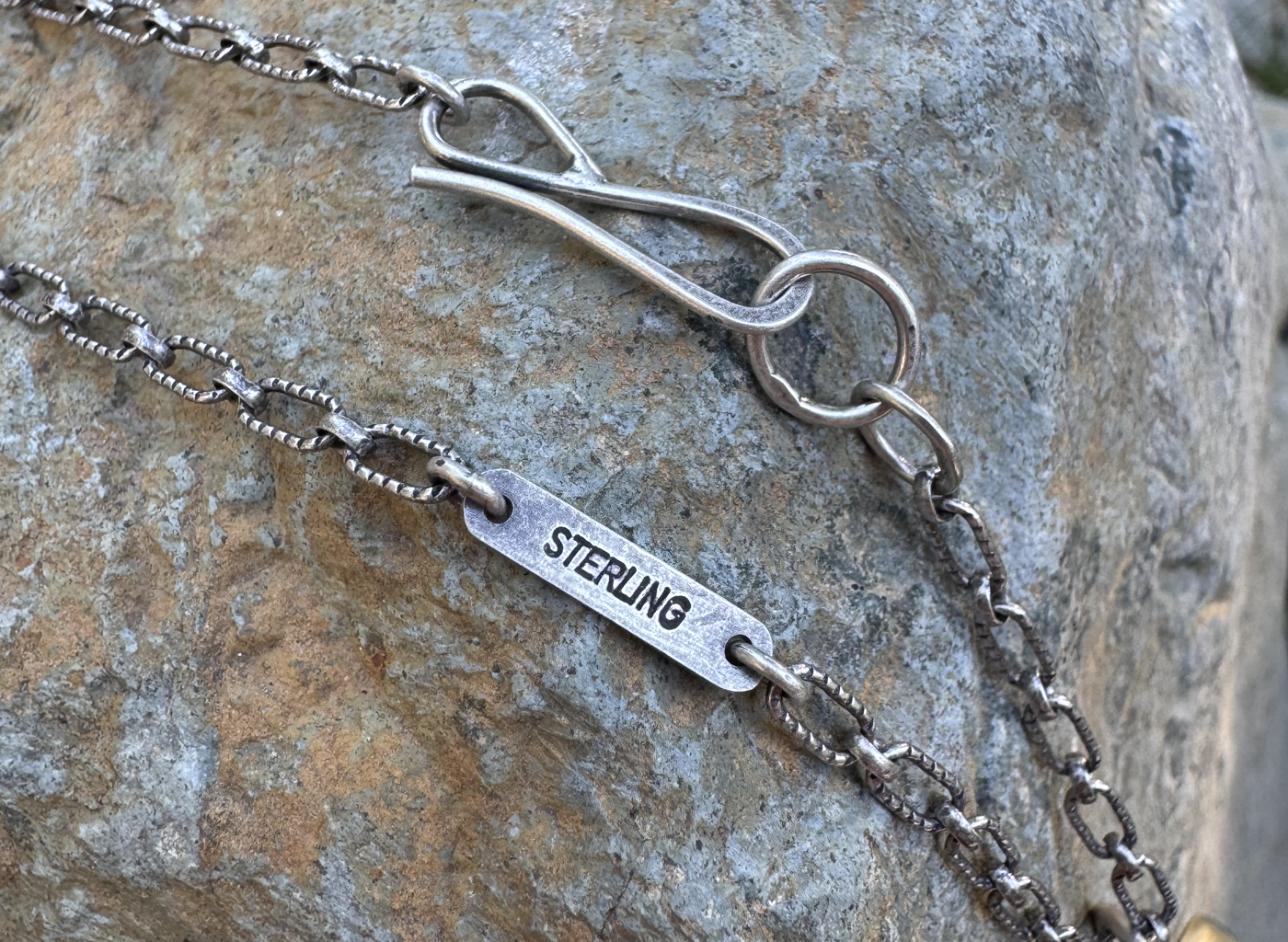 river stone, handmade brass setting, handmade sterling silver chain